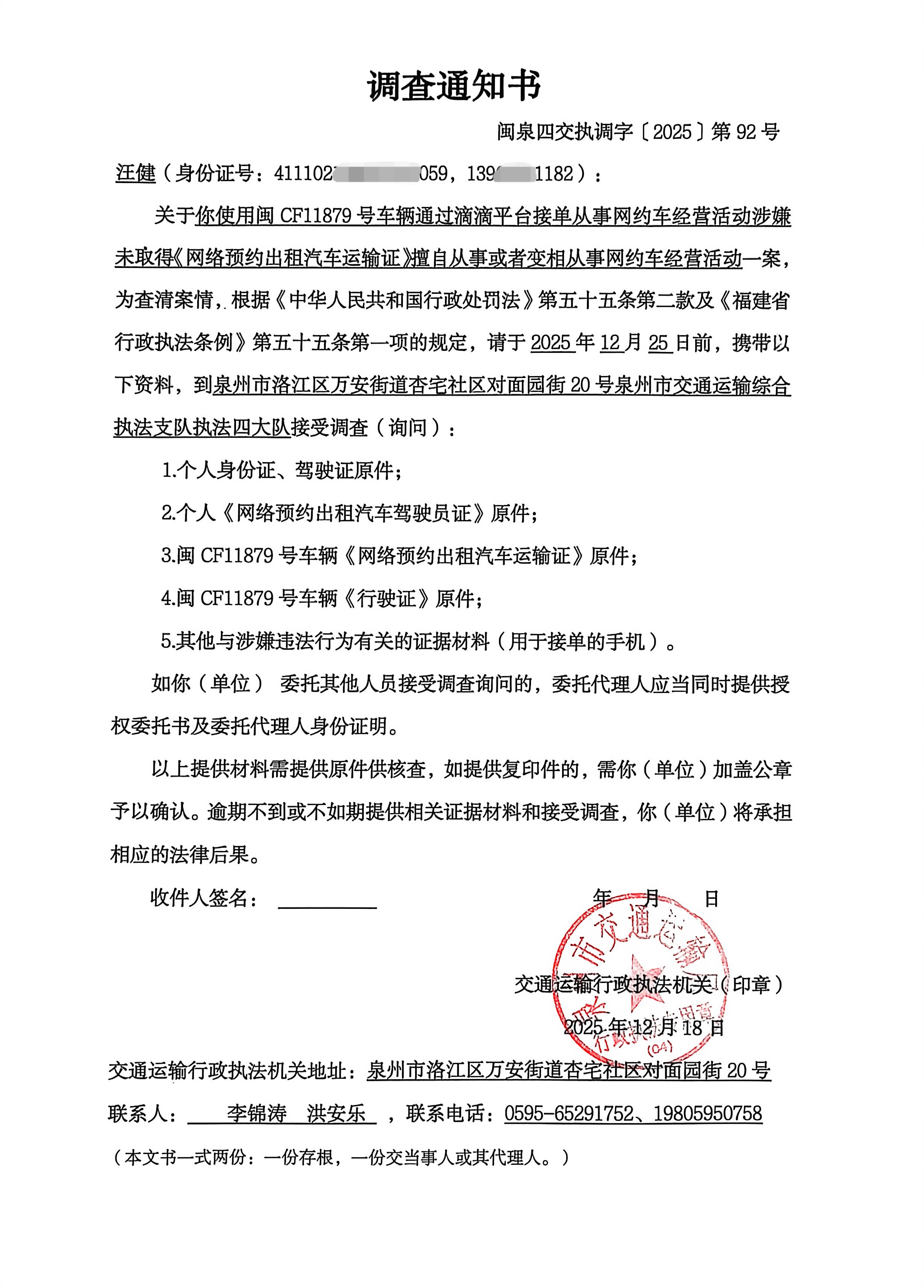关于你使用闽CF11879号车通过滴滴平台接单从事网约车经营活动涉嫌未取得《网络预约出租汽车运输证》擅自从事或者变相从事网约车经营活动一案,为查清案情,根据《中华人民共和国行政处罚法》第五十五条第二款及《福建省行政执法条例》第五十五条第一项的规定,请于收到本通知书之日起五个自然日内,携带以下资料,到泉州市洛江区万安街道杏宅社区对面园街20号泉州市交通运输综合执法支队执法四大队接受调查(询问):