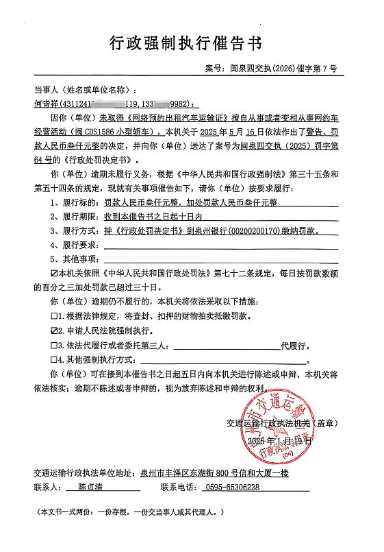 本机关于2025年7月15日因你未取得《网络预约出租汽车运输证》擅自从事或者变相从事网约车经营活动依法向你送达了《行政处罚决定书》,案号:闽泉四交执(2025)罚字第64号。本机关于2026年1月19日对你未取得《网络预约出租汽车运输证》擅自从事或者变相从事网约车经营活动一案作出催告,催告你依法履行闽泉四交执(2025)罚字第64号的处罚决定:警告、罚款人民币叁仟元整,并催告你缴纳因未在法定期限内履行闽泉四交执(2025)罚字第64号的处罚决定产生的加处罚款人民币叁仟元整。