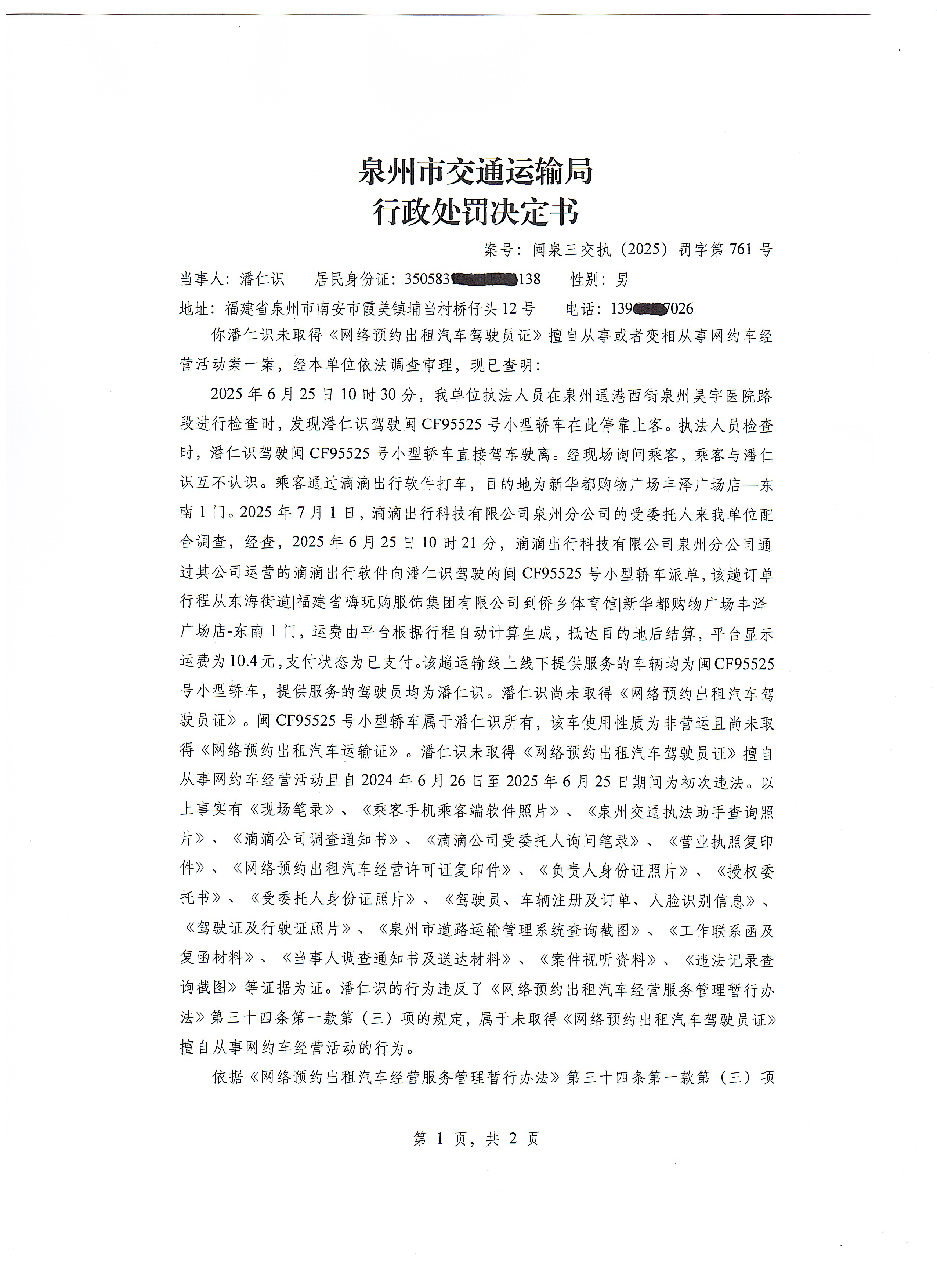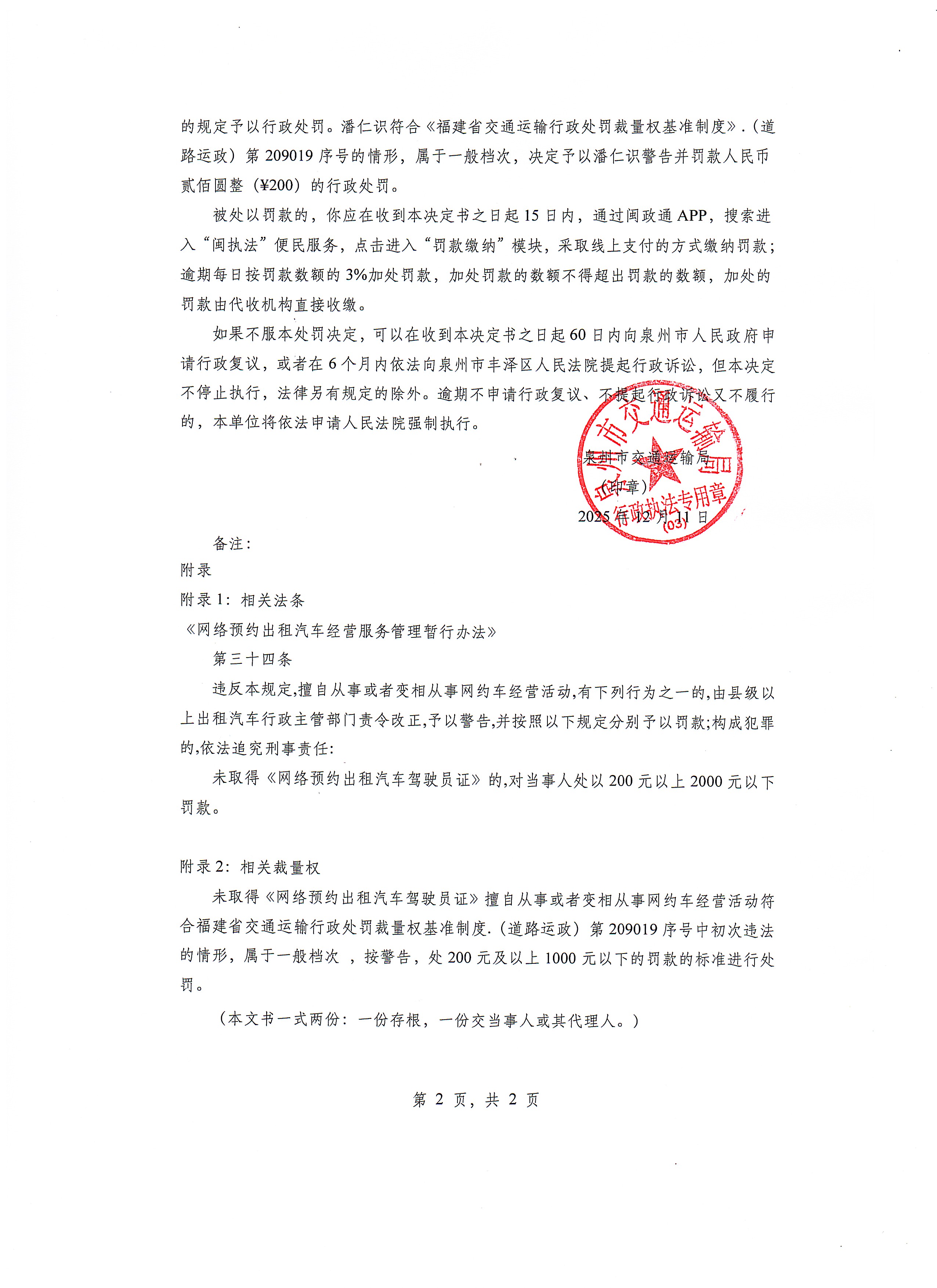 本机关于2025年12月11日对你未取得《网络预约出租汽车驾驶员证》擅自从事或者变相从事网约车经营活动案作出警告,并处以罚款人民币贰佰元的行政处罚决定。