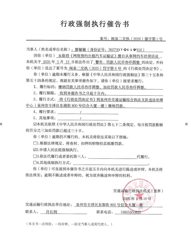 本机关于2025年05月13日因你(单位)未取得《网络预约出租汽车运输证》擅自从事网约车经营活动依法向你送达了《行政处罚决定书》,案号: 闽泉二交执(2025)罚字第6号。本机关于2026年01月16日对你(单位)未取得《网络预约出租汽车运输证》擅自从事网约车经营活动一案作出催告,催告你(单位)依法履行闽泉二交执(2025)罚字第6号的处罚决定:罚款人民币叁仟元整,并催告你(单位)缴纳因未在法定期限内履行闽泉二交执(2025)罚字第6号的处罚决定产生的加处罚款人民币叁仟元整。
