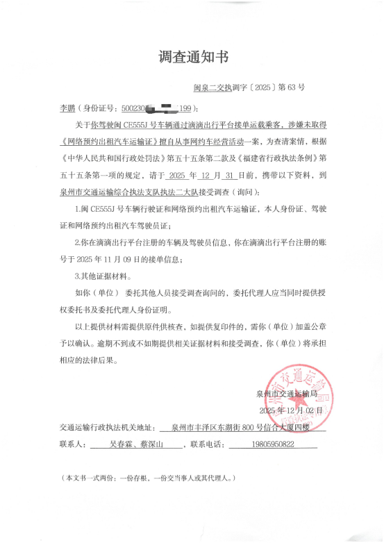 关于你于2025年11月09日15时41分驾驶闽CE555J号小型轿车通过滴滴网约车平台涉嫌未取得《网络预约出租汽车运输证》擅自从事网约车经营活动一案,为查清案情,根据《中华人民共和国行政处罚法》第五十五条第二款及《福建省行政执法条例》第五十五条第一项的规定,请于收到本通知书之日起五个自然日内,携带以下资料,到泉州市丰泽区东湖街800号信合大厦四楼泉州市交通运输综合执法支队执法二大队接受调查(询问):
