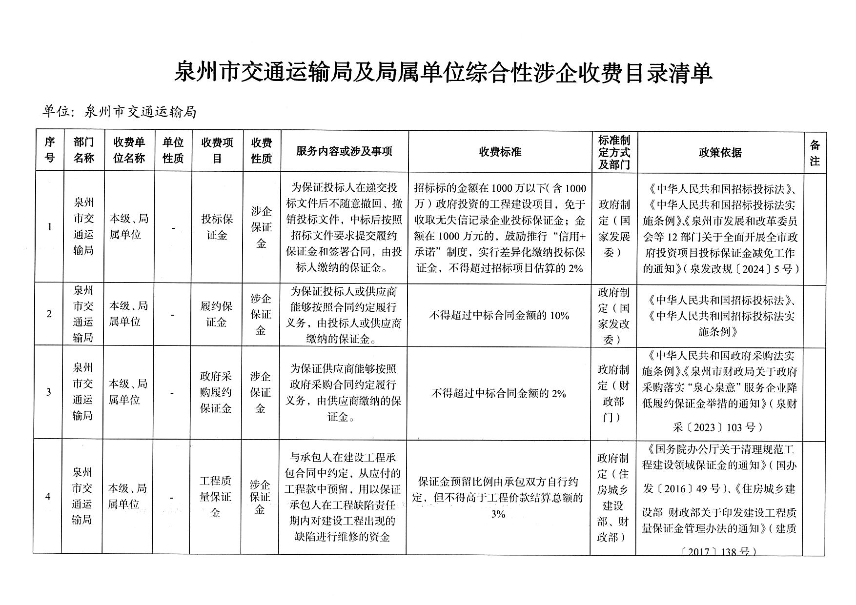 泉州市交通运输局及局属单位综合性涉企收费目录清单